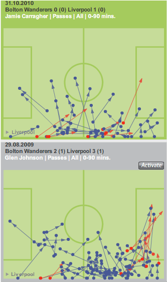 In all Carragher played around half the number of passes as Johnson did in the same game last season, and failed to use the wings effectively to get crosses in to the box.