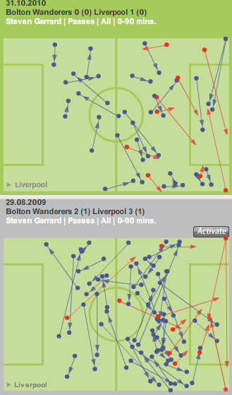 Gerrard sees a lot less of the ball under Liverpool’s new system. Without wingers pushing forwards he has nobody to pass to out wide on the wings, forced to keep the ball moving through the middle – much easier to defend against. Whereas most of his play used to be 15 yards outside the penalty box he now barely gets a touch in that position.