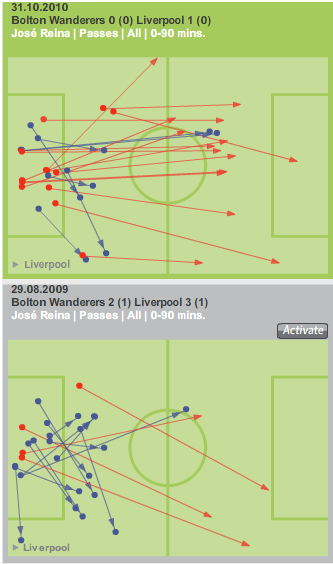 Reina saw much more of the ball, but rather than electing to build up play like last year the reds now adopt a strategy of long punts upfield. Only twice did this strategy find a Liverpool player. Usually Torres who would then be pounced upon. The red arrows indicate the failed hoofs.